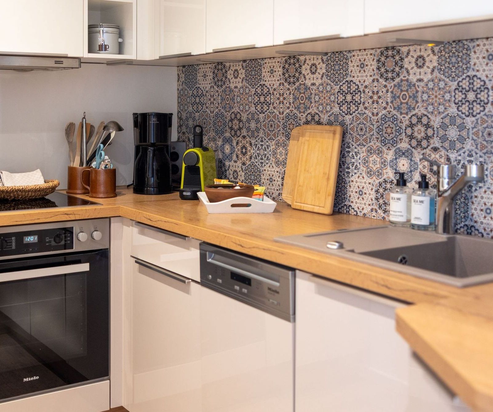 Die helle Küche ist zum Kochen umfangreich bestückt und mit Qualitätsgeräten von Miele ausgestattet.