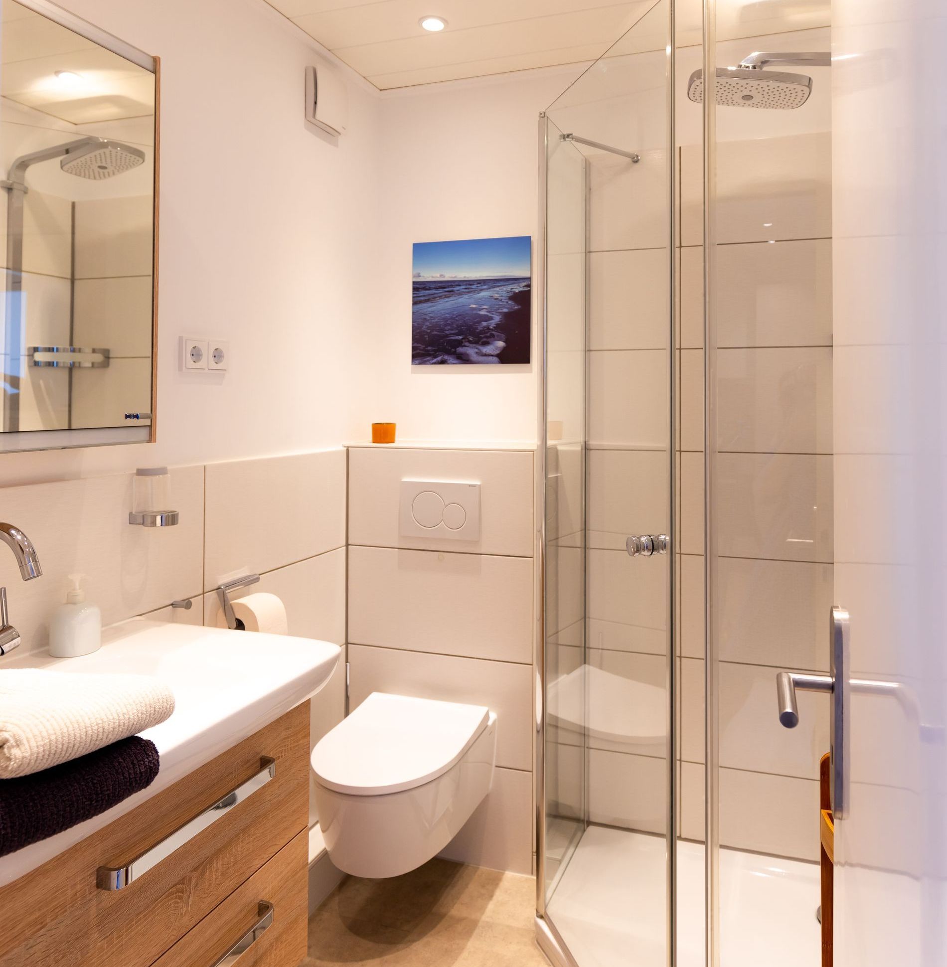 Vom Schlafzimmer aus hören Sie das Wellenrauschen und werden in einem Queensize Bett erholt aufwachen. Das hochwertige Bad glänzt auf kleinstem Raum. In der begehbaren Ankleide haben Sie viel Stauraum.
